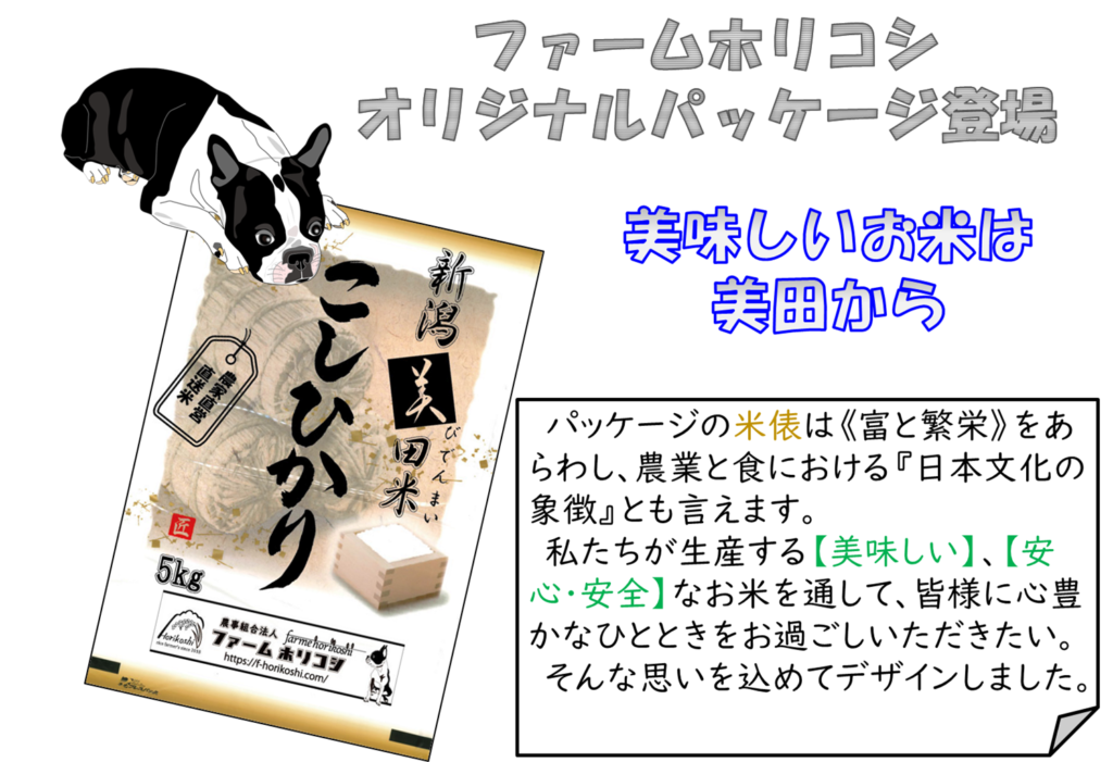 オリジナルパッケージ登場 農事組合法人 X Facebook はてブ LINE コピー 2026.04.17 5kgオンリーですが、オリジナルの米袋だす、数十種類のベースパッケージから俵デザインをチョイス、文字は地元書道家の作品となってます。